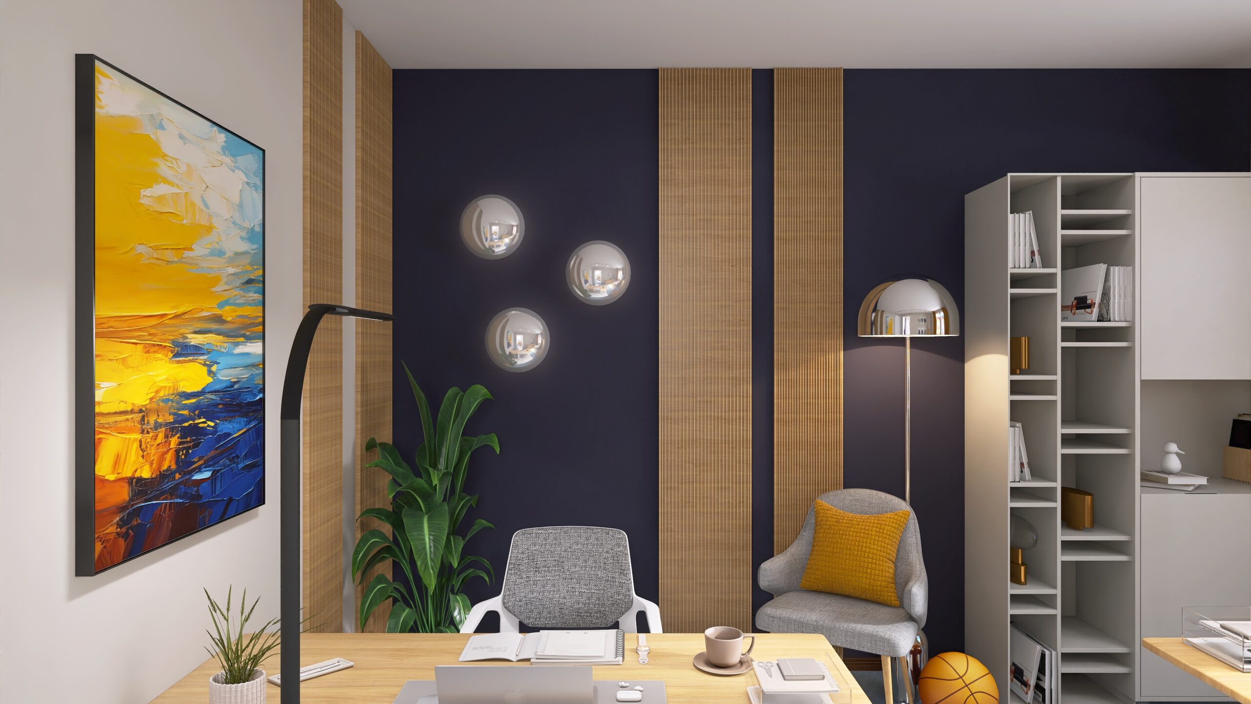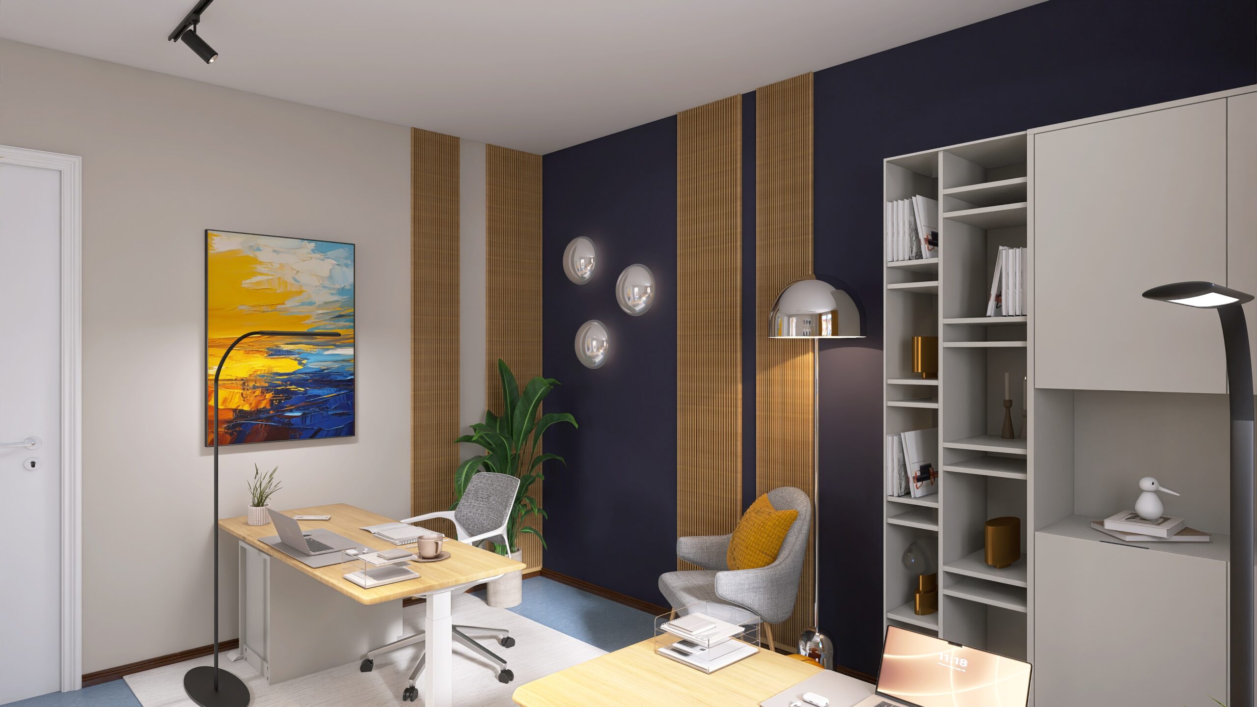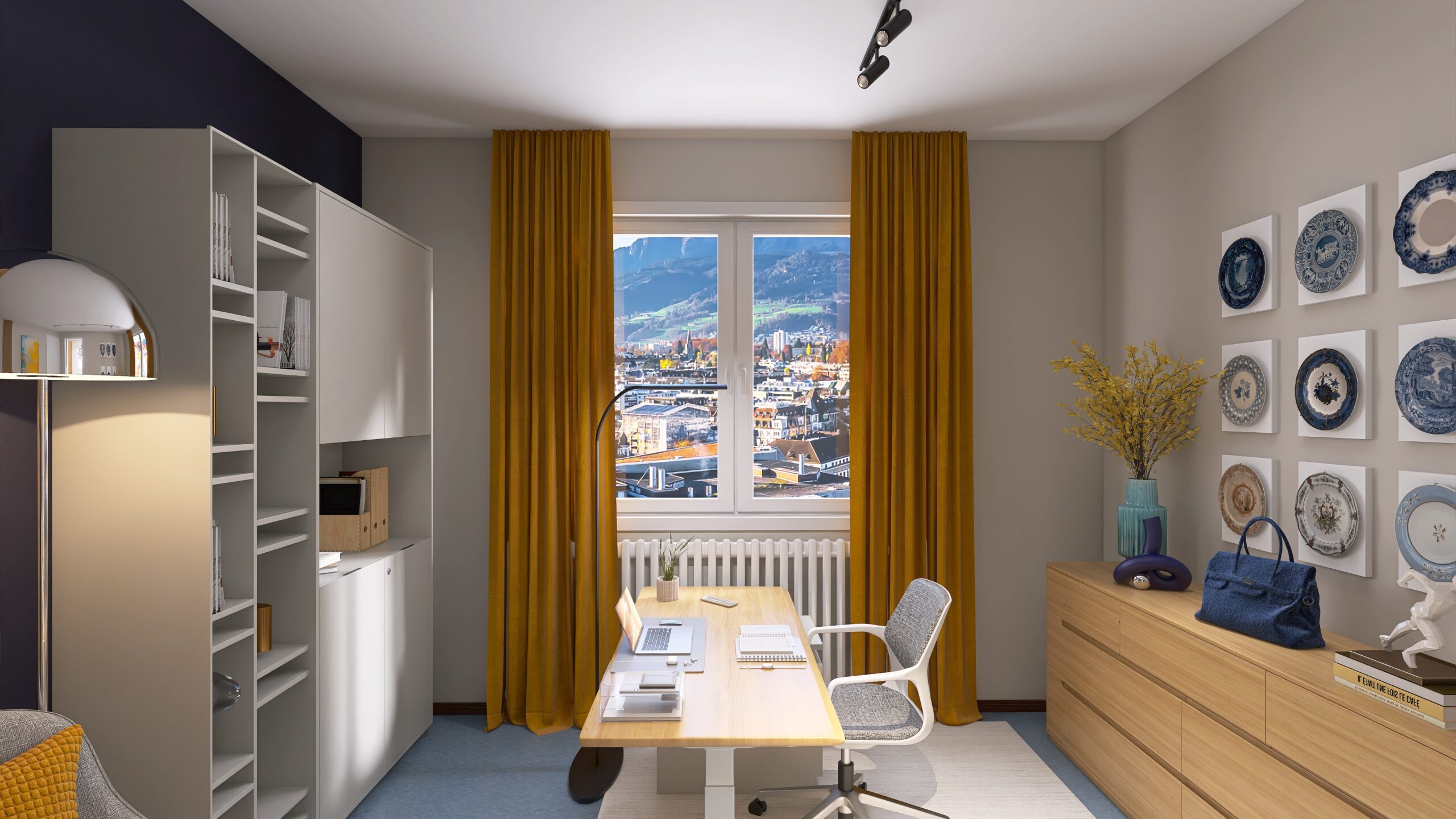 Modern und gemütlich gestaltet, vereint der Workspace klare Strukturen mit Wohlfühlatmosphäre. Sanfte Gelbtöne bringen freundliche Akzente, während das Corporate-Blau Verlässlichkeit und Professionalität vermittelt. Ein Ort, an dem Kreativität fließt und Arbeiten Freude macht.