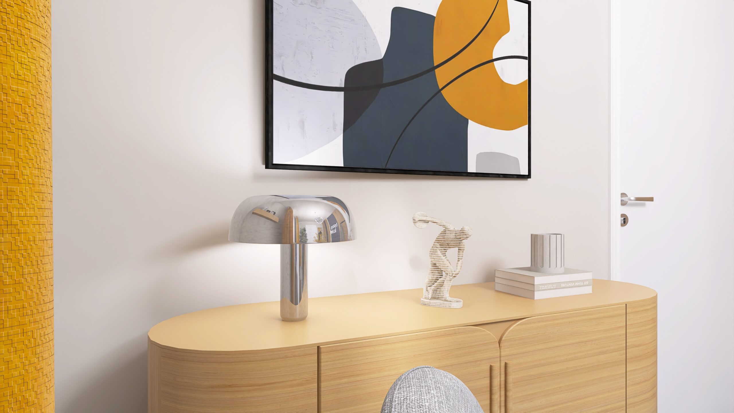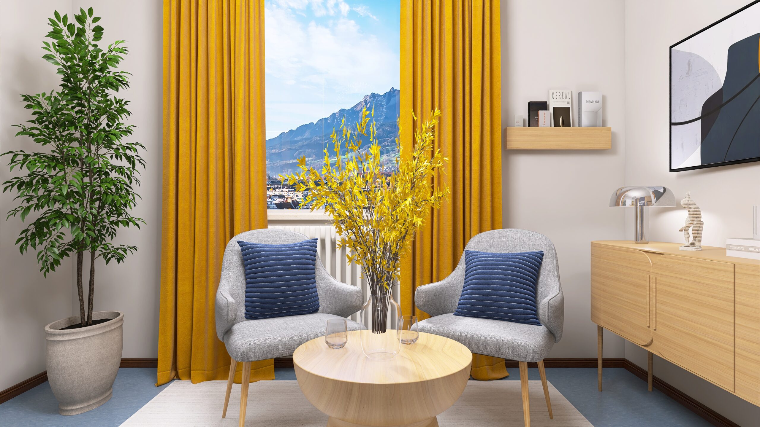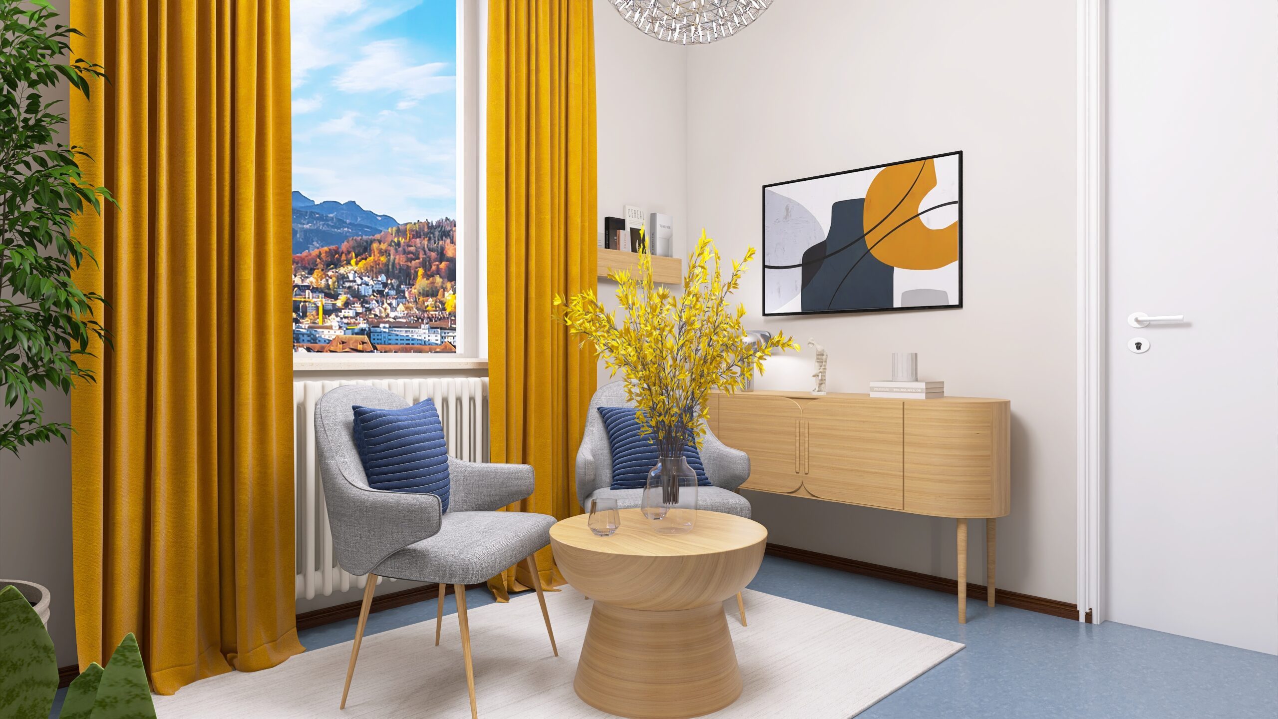 Modern und gemütlich gestaltet, vereint der Workspace klare Strukturen mit Wohlfühlatmosphäre. Sanfte Gelbtöne bringen freundliche Akzente, während das Corporate-Blau Verlässlichkeit und Professionalität vermittelt. Ein Ort, an dem Kreativität fließt und Arbeiten Freude macht.