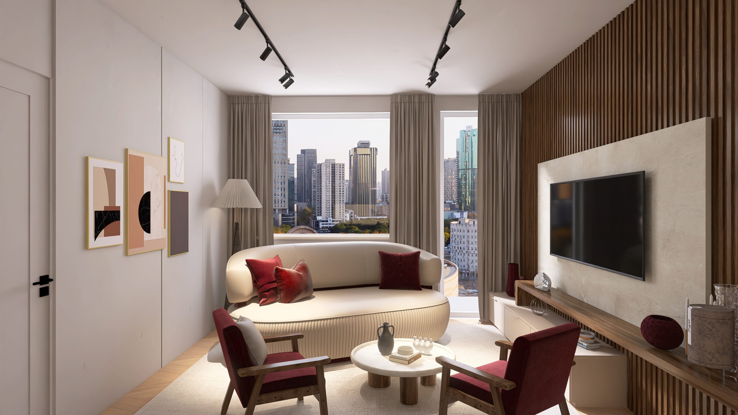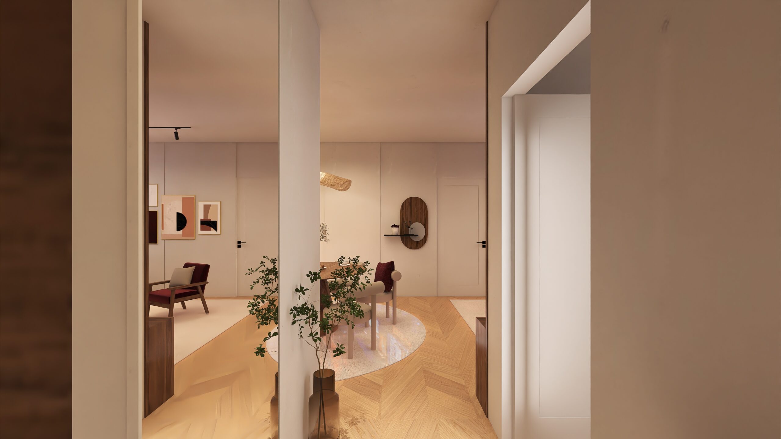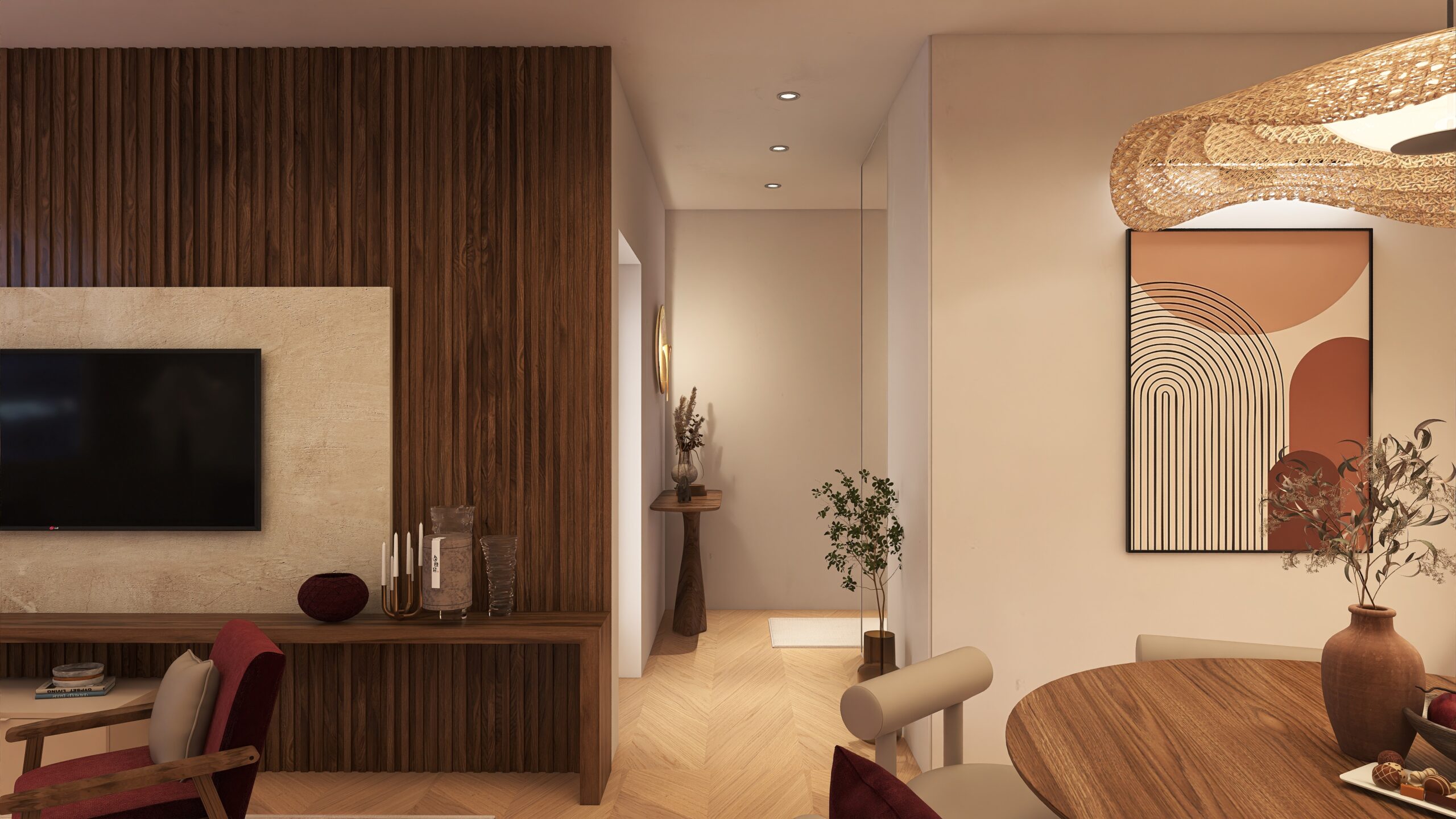 Die Neugestaltung schafft Räume, die Ruhe, Balance und Ausgleich vermitteln. Moderner, gemütlicher Stil mit klaren Linien, hellen Naturmaterialien und gezielten Farbakzenten verwandelt das Zuhause in einen harmonischen Rückzugsort voller Leichtigkeit und Komfort.