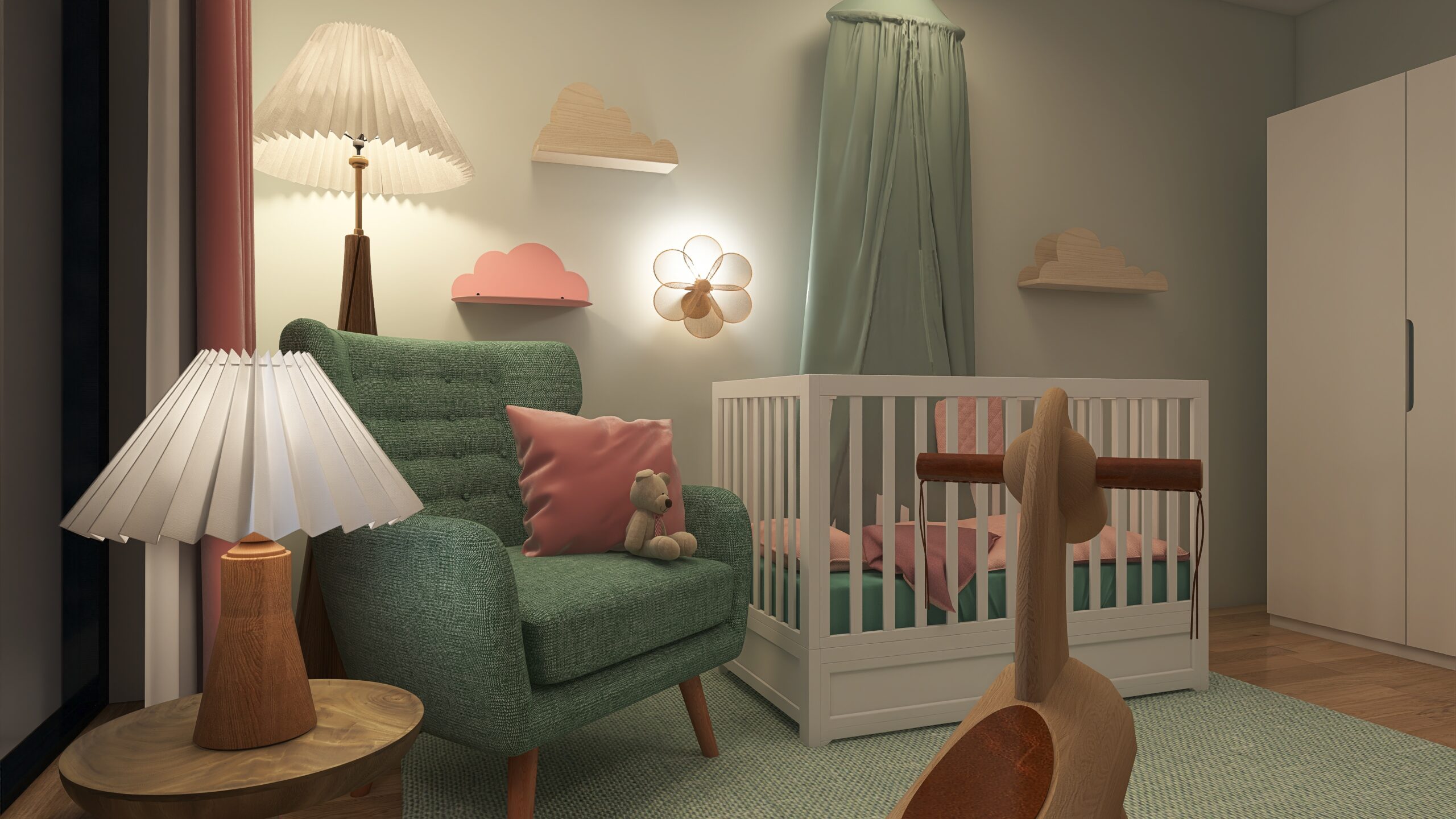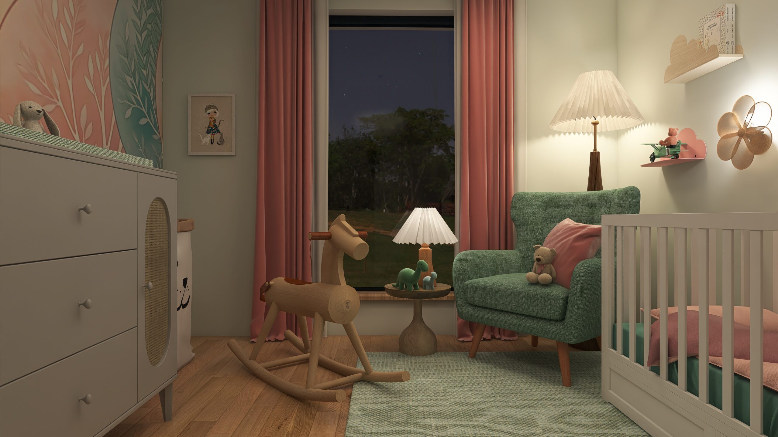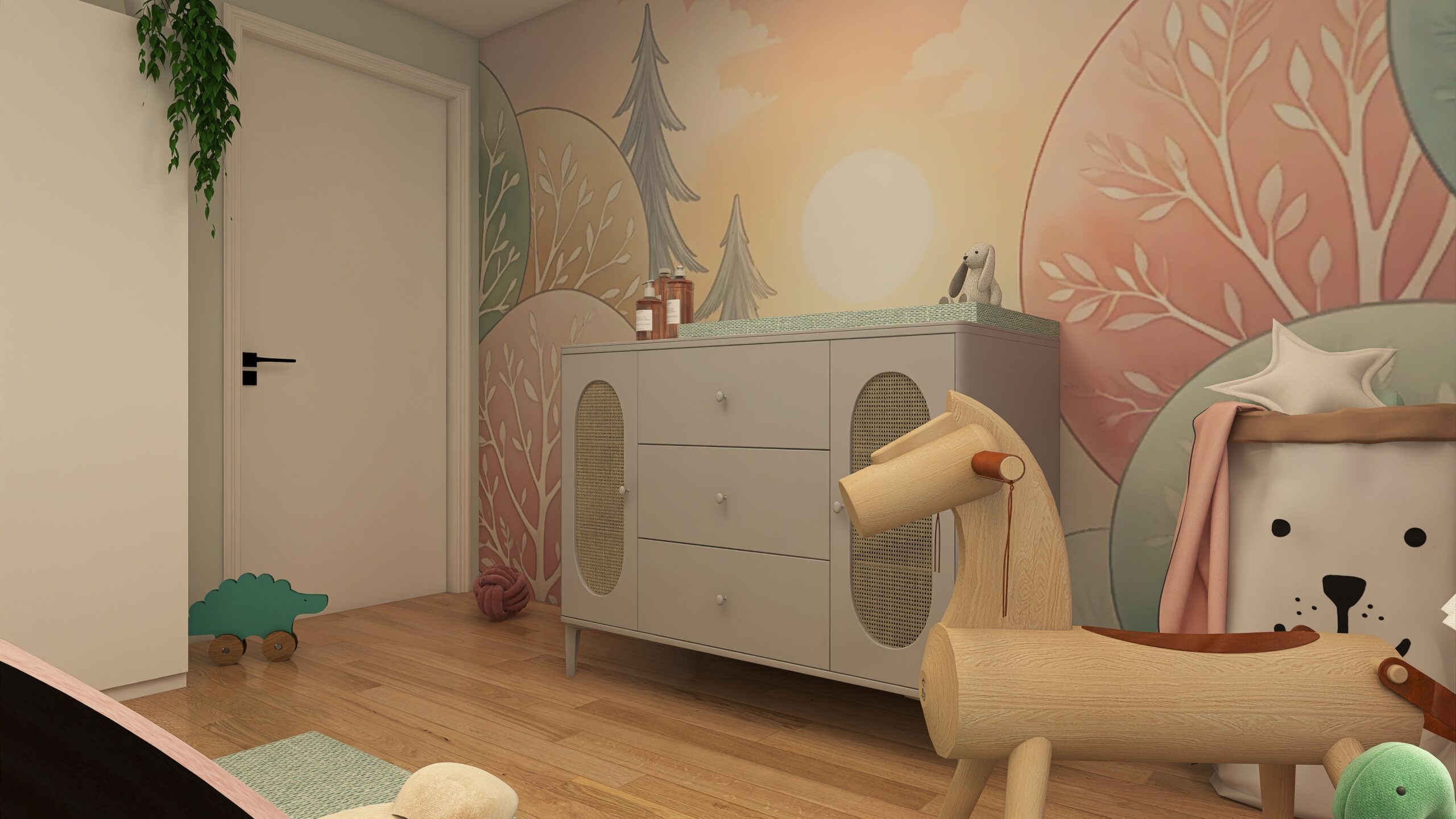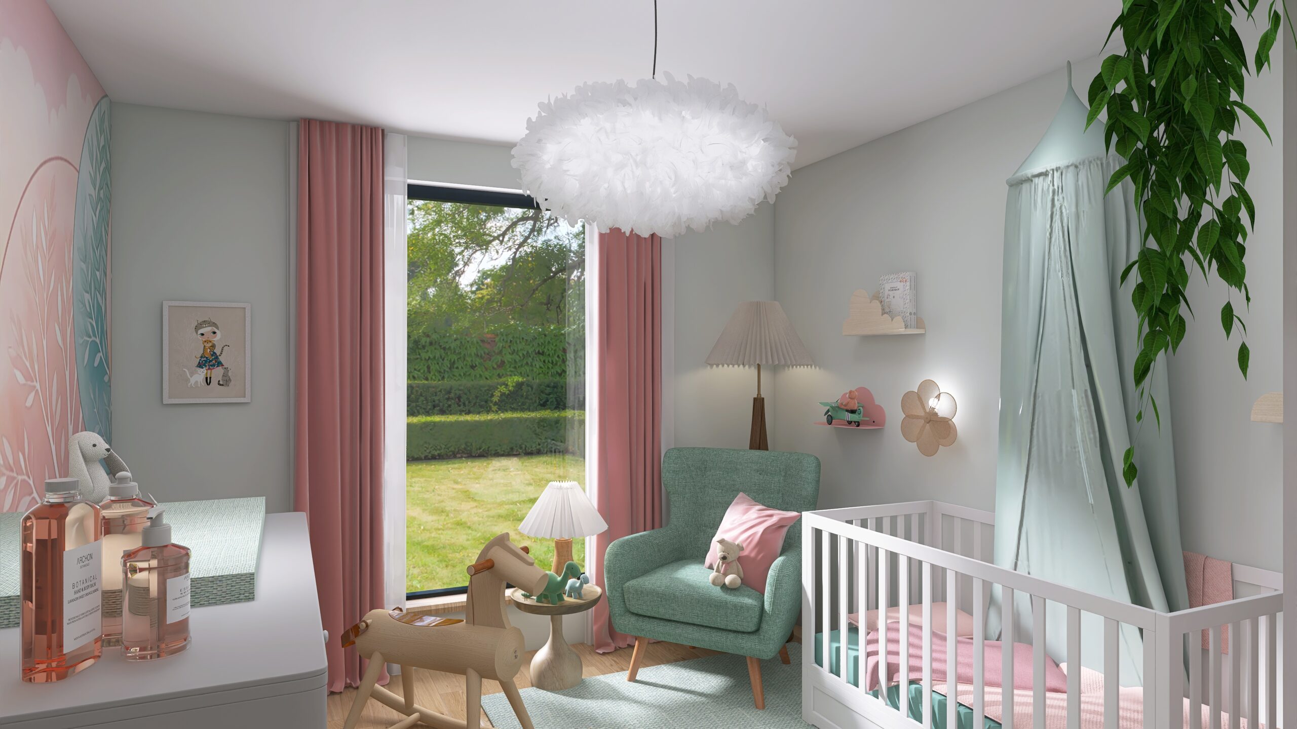 Altrosé und zarte Pastelltöne hüllen das Kinderzimmer in eine ruhige, märchenhafte Atmosphäre.
