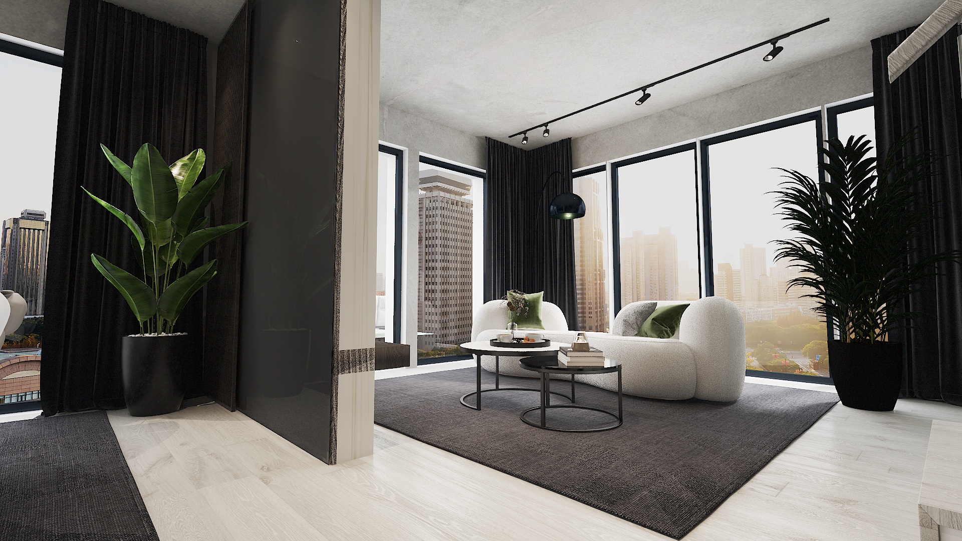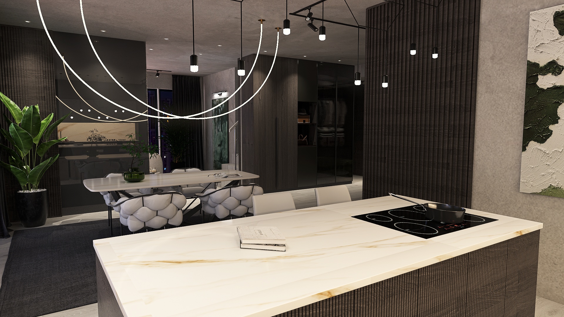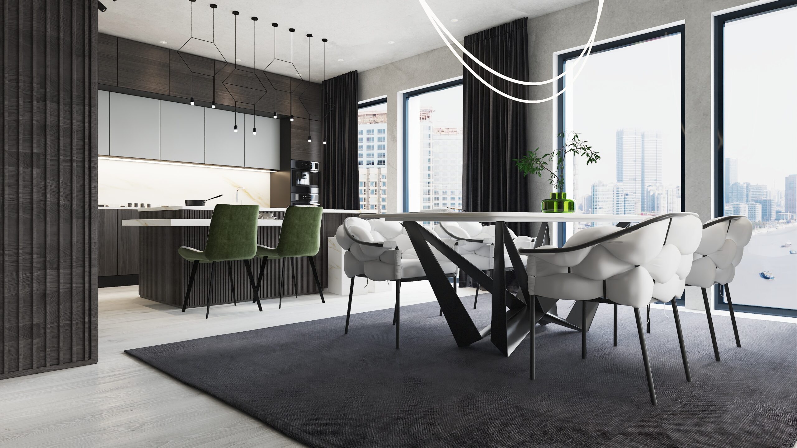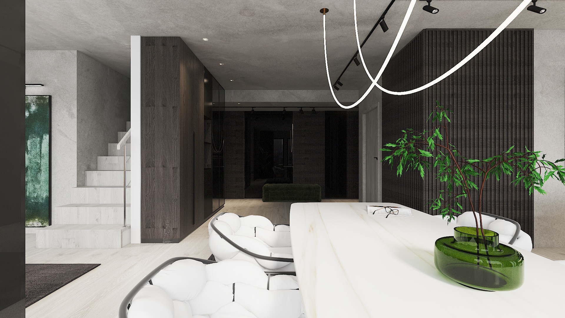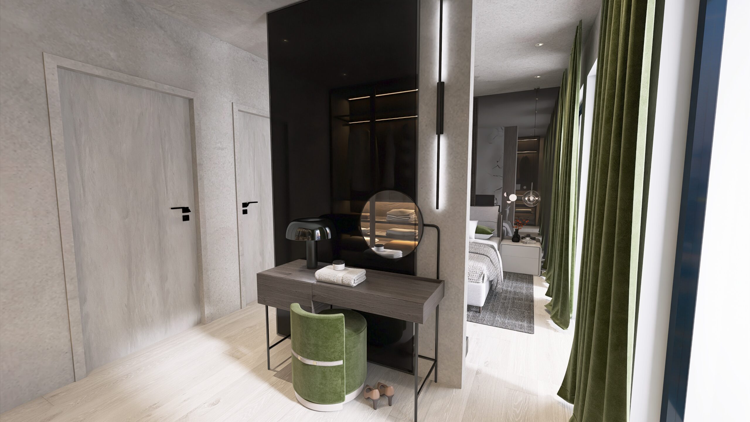 Auf 112 m² wird eine Wohnung in einem dunklen, forest-inspirierten Loft-Stil gestaltet, mit dunklen, warmen Farben, hochwertigen Materialien und stilvollen Möbeln. Das Ergebnis ist ein elegantes Zuhause, das Ruhe, Komfort und urbanen Charakter vereint.